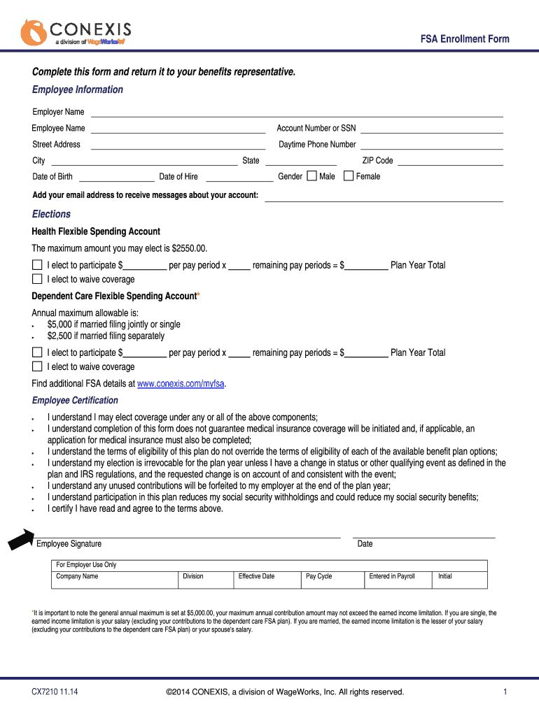 Employees who wish to participate in the FSA and DCAP programs offered through Conexis are required to file the conexis-fsa-dcap-enrollment-form.