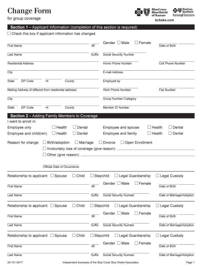Change Form for group coveragebcbsks. Collection 1 Applicant Information (completion of this section is required)CLEAR Hatcheck this box if applicant information has changed. First Nameless Name MI