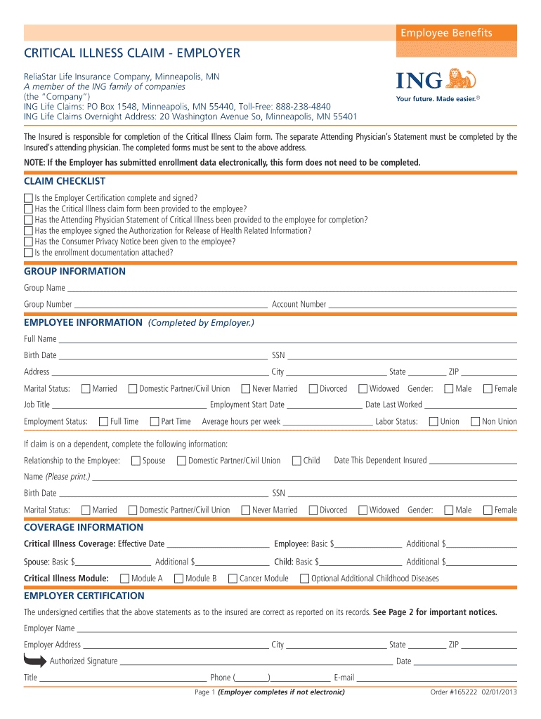 RESET FORM Employee BenefitsCRITICAL ILLNESS CLAIM EMPLOYER Register Life Insurance Company, Minneapolis, MN A member of the ING family of companies (the Company) ING Life Claims: PO Box 1548, Minneapolis,