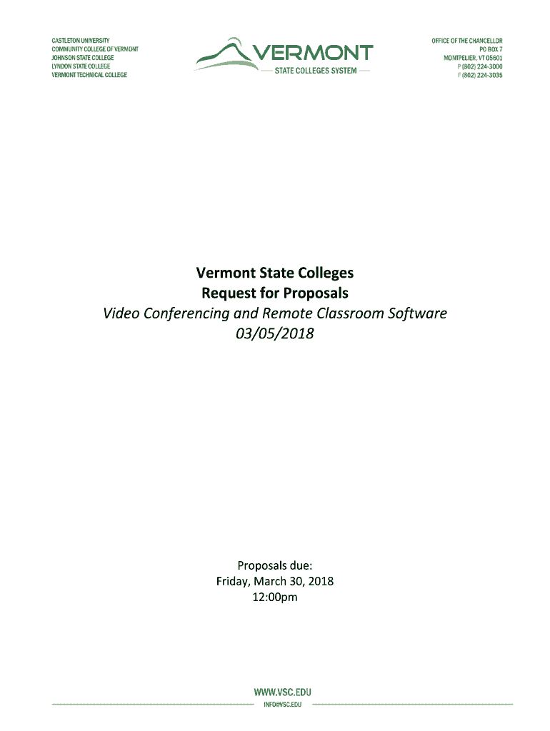 Vermont State Colleges Request for Proposals Video Conferencing and Remote Classroom Software 03/05/2018Proposals due: Friday, March 30, 2018 12:00pm1.0 Organizational History 1.1 General Information