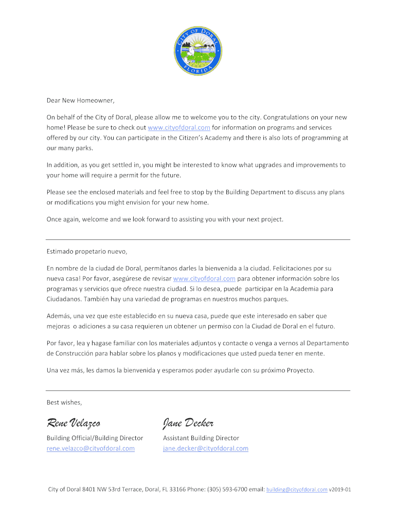 DearNewHomeowner, OnbehalfoftheCityofDoral, pleaseallowmetowelcomeyoutothecity. Congratulationsonyournew home! Pleasebesuretocheckoutwww.cityofdoral.comforinformationonprogramsandservices offeredbyourcity.