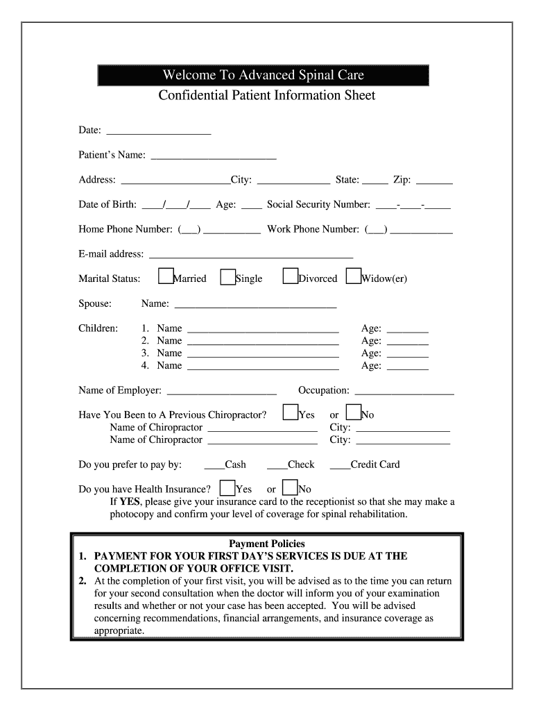 Welcome To Advanced Spinal Care Confidential Patient Information Sheet Date: Patients Name: Address: City: State: Zip: Date of Birth: / / Age: Social Security Number: Home Phone Number: () Work Phone