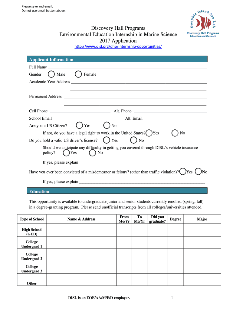 Please save and email. Do not use email button above. Discovery Hall Programs Environmental Education Internship in Marine Science 2017 Application http://www.disl.org/dhp/internshipopportunities/Applicant