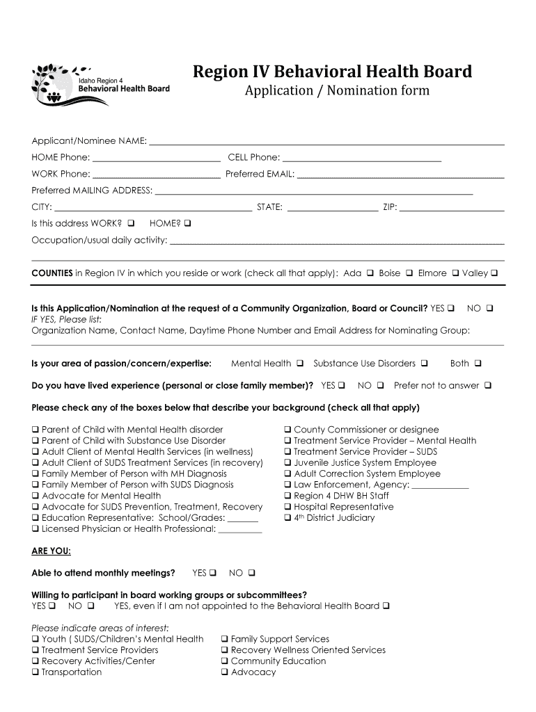 Region IV Behavioral Health Board Application / Nomination formApplicant/Nominee NAME: HOME Phone:CELL Phone:WORK Phone:Preferred EMAIL:Preferred MAILING ADDRESS: CITY: Is this address WORK? STATE:ZIP:HOME?