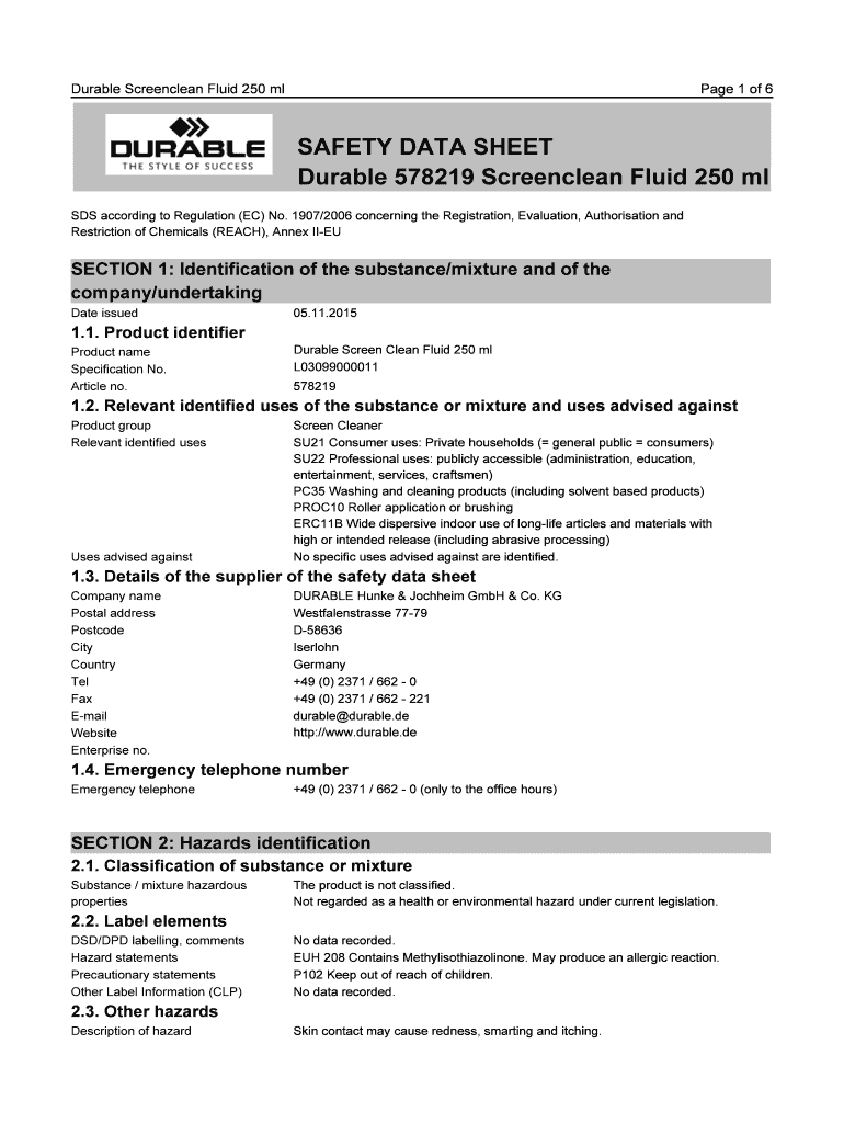 Get the free SAFETY DATA SHEET Durable 578219 Screenclean Fluid ...