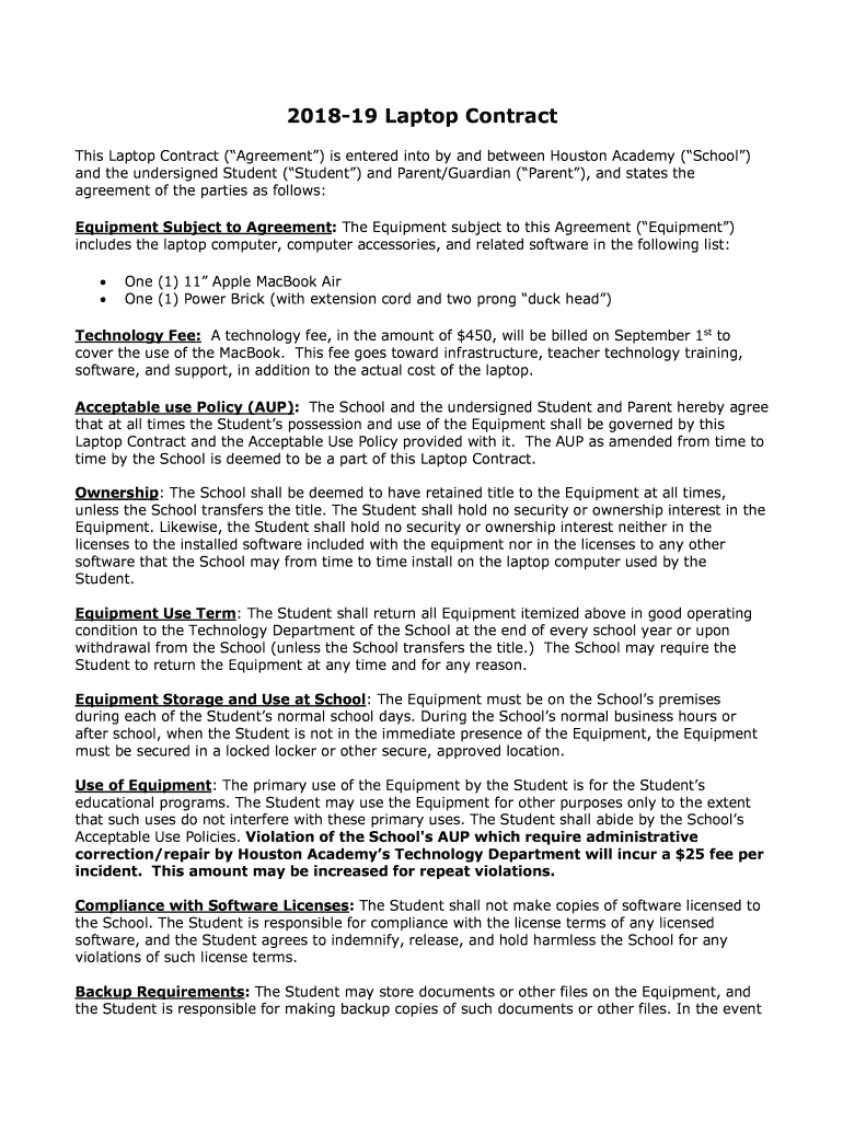 201819 Laptop Contract This Laptop Contract (Agreement) is entered into by and between Houston Academy (School) and the undersigned Student (Student) and Parent/Guardian (Parent), and states the agreement