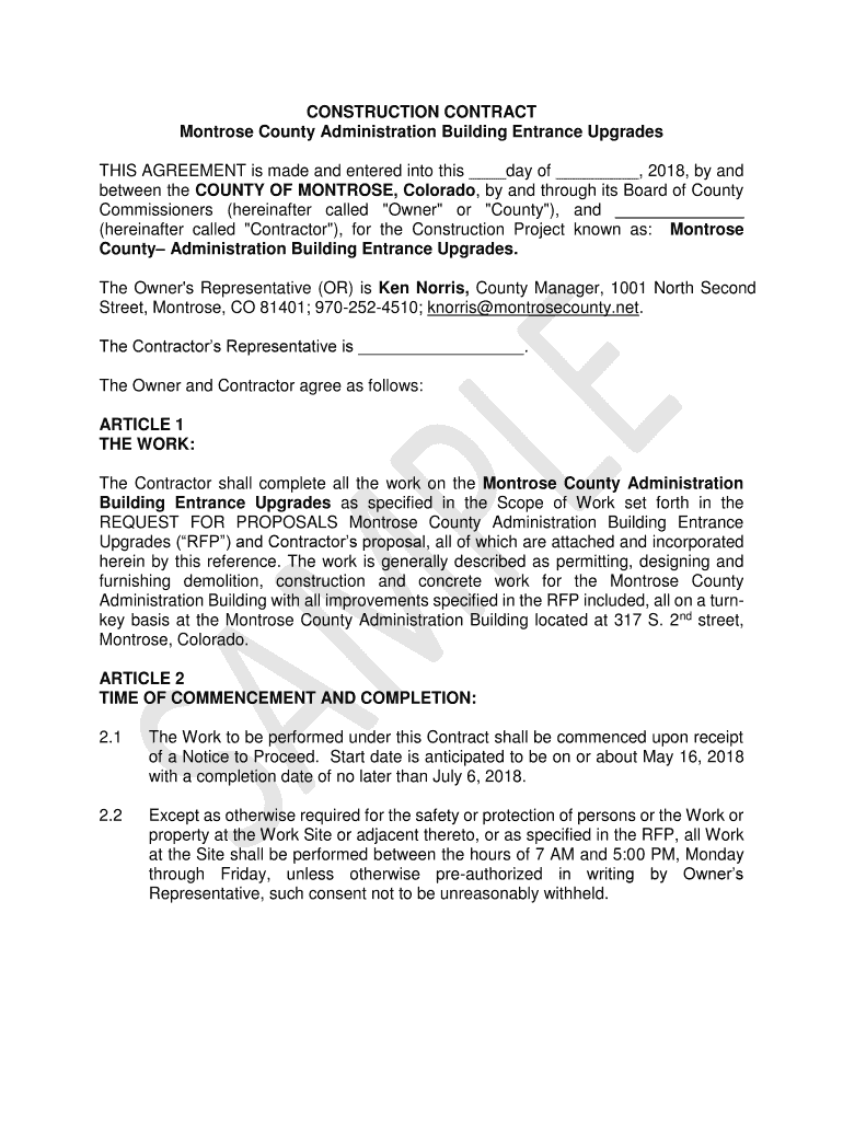 CONSTRUCTION CONTRACT Montrose County Administration Building Entrance Upgrades THIS AGREEMENT is made and entered into this day of, 2018, by and between the COUNTY OF MONTROSE, Colorado, by and through