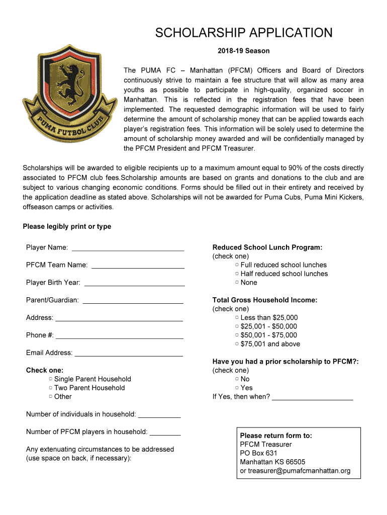 SCHOLARSHIP APPLICATION 201819 Season The PUMA FC Manhattan (PFC) Officers and Board of Directors continuously strive to maintain a fee structure that will allow as many area youths as possible to