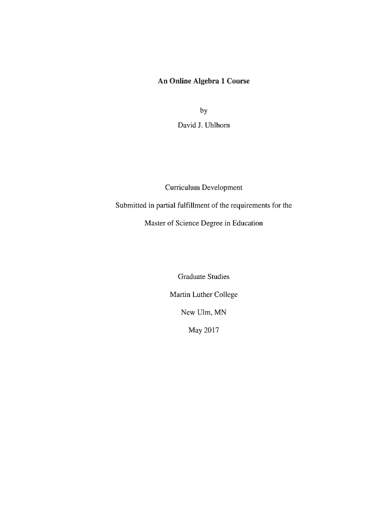 An Online Algebra 1 Course by David J. UhlhornCurriculum Development Submitted in partial fulfillment of the requirements for the Master of Science Degree in EducationGraduate Studies Martin Luther