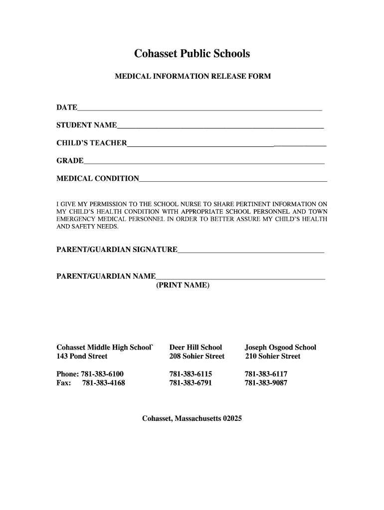 Cosset Public Schools MEDICAL INFORMATION RELEASE FORMAT STUDENT NAME CHILD TEACHER GRADE MEDICAL CONDITION I GIVE MY PERMISSION TO THE SCHOOL NURSE TO SHARE PERTINENT INFORMATION ON MY CHILD HEALTH