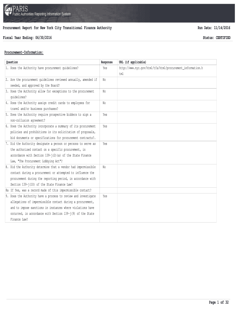 Procurement Report for New York City Transitional Finance Authority Date: 11/14/2016Fiscal Year Ending: 06/30/2016Status: CERTIFIEDProcurementInformation: