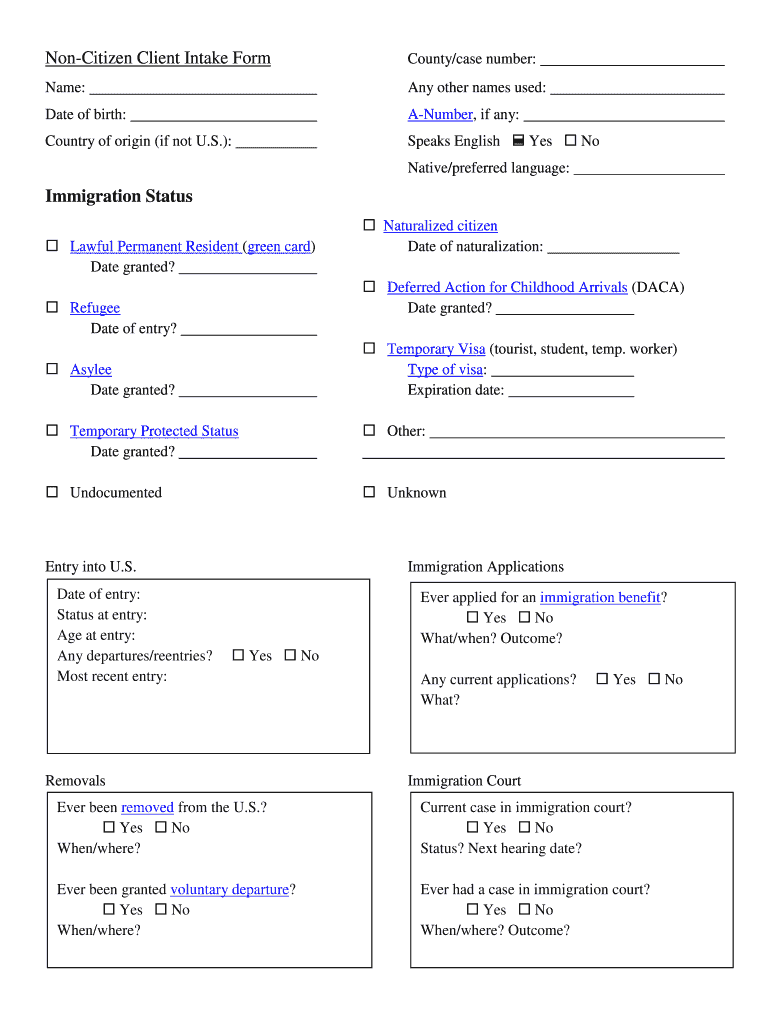 Citizen Client Intake Forecourt/case number:Name:Any other names used:Date of birth:Number, if any:Country of origin (if not U.S.):Speaks English Yes No Native/preferred language:Immigration Status