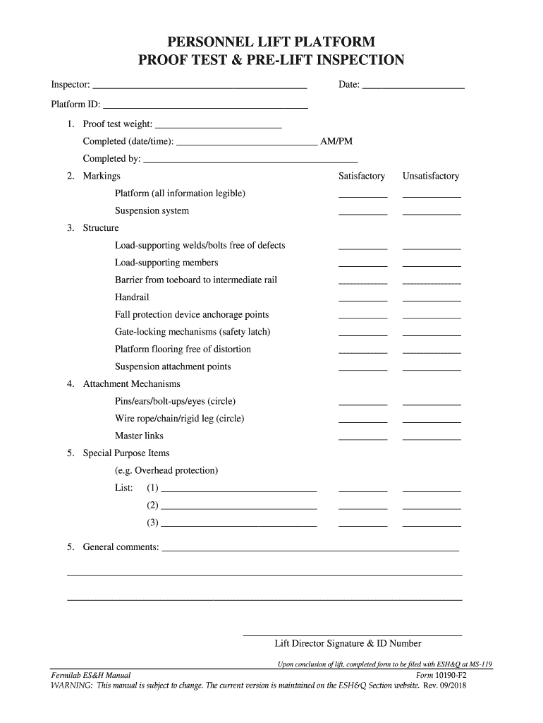 PERSONNEL LIFT PLATFORM PROOF TEST & PREDICT INSPECTION Inspector: Date: Platform ID: 1. Proof test weight: Completed (date/time): AM/PM Completed by: 2. MarkingsSatisfactoryUnsatisfactoryPlatform