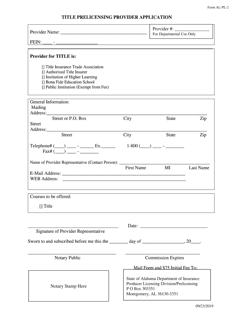Form ALPL2TITLE LICENSING PROVIDER APPLICATION Provider Name: Provider #: For Departmental Use OnlyFans: Provider for TITLE is: Title Insurance Trade Association Authorized Title Insurer Institution