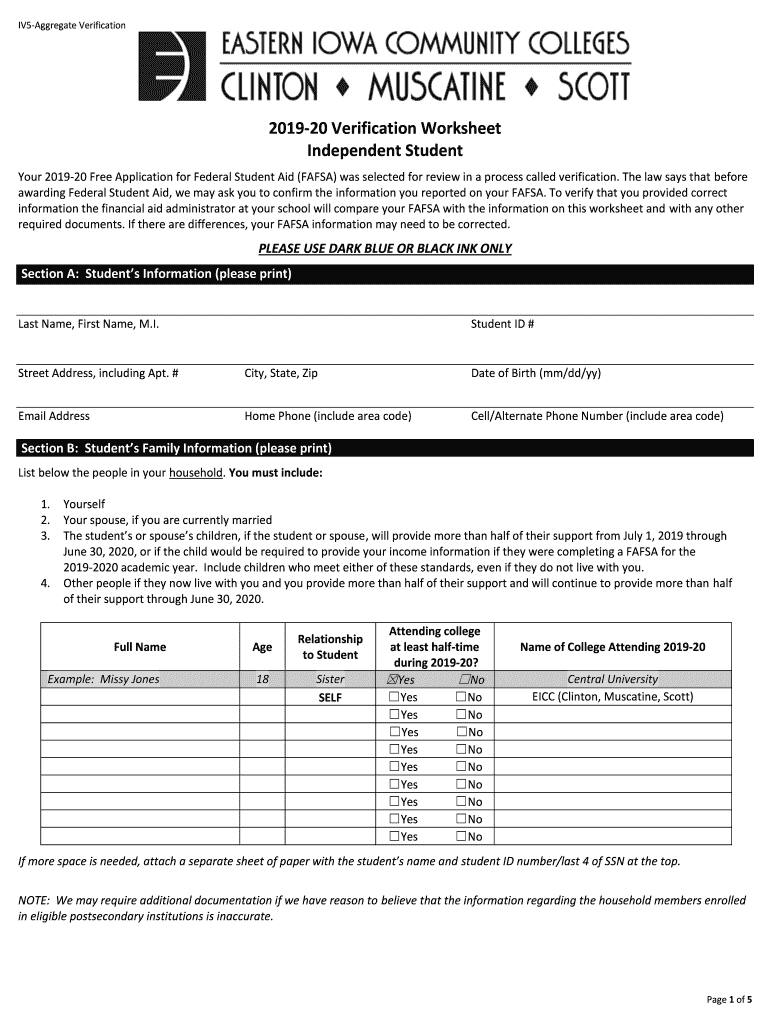 Independent students who are applying for financial aid may need to fill out a verification worksheet.