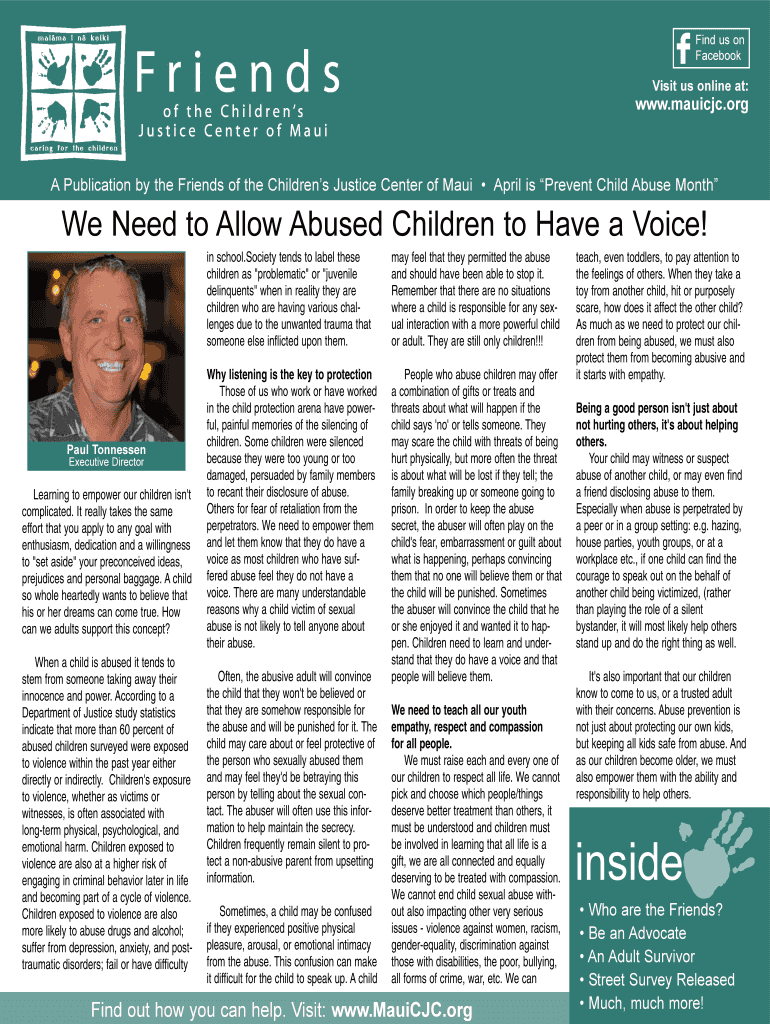 Find us on FacebookVisit us online at:www.mauicjc.orgA Publication by the Friends of the Children's Justice Center of Maui April is Prevent Child Abuse Months Need to Allow Abused Children to Have