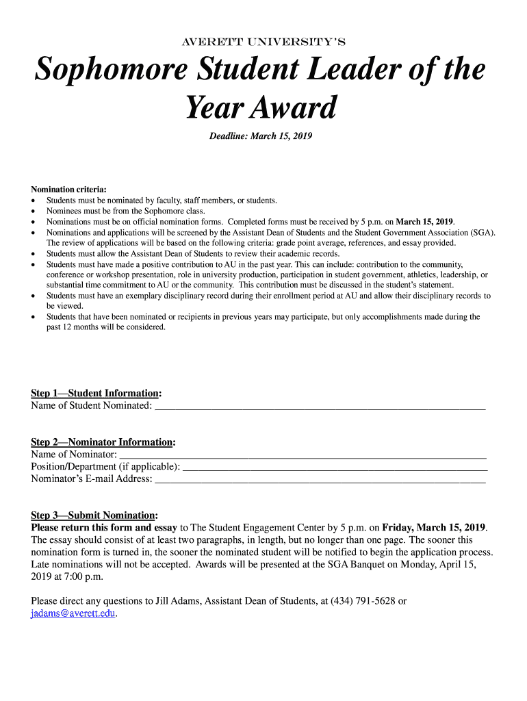 Everett UniversitysSophomore Student Leader of the Year Award Deadline: March 15, 2019Nomination criteria: Students must be nominated by faculty, staff members, or students. Nominees must be from