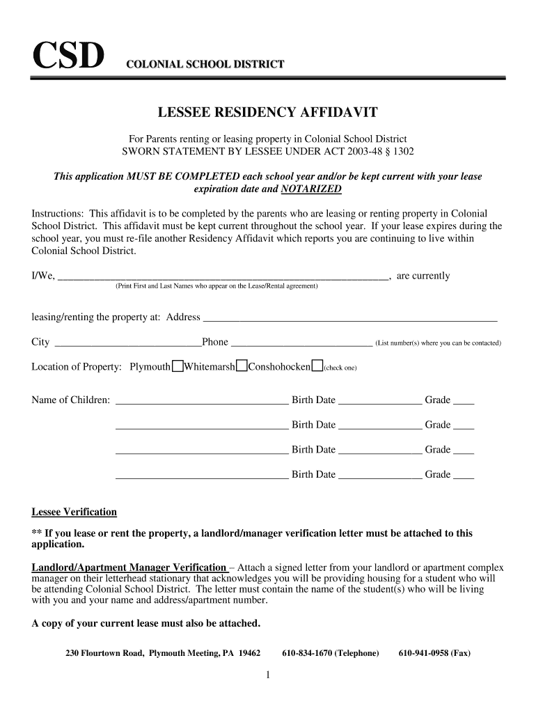 COLONIAL SCHOOL DISTRICTLESSEE RESIDENCY AFFIDAVIT For Parents renting or leasing property in Colonial School District SWORN STATEMENT BY LESSEE UNDER ACT 200348 1302 This application MUST BE COMPLETED
