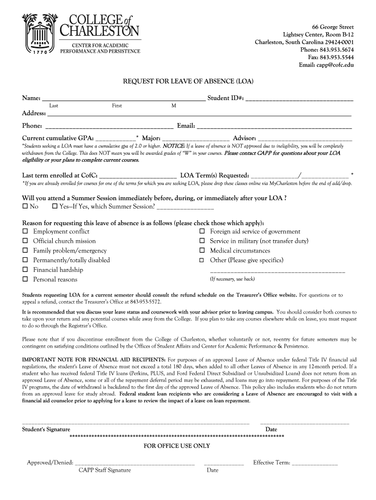 66 George Streetlights Center, Room B12 Charleston, South Carolina 294240001 Phone: 843.953.5674 Fax: 843.953.5544 Email: camp CFC.request FOR LEAVE OF ABSENCE (LOA) Name: Address: Student ID#: Nastiest