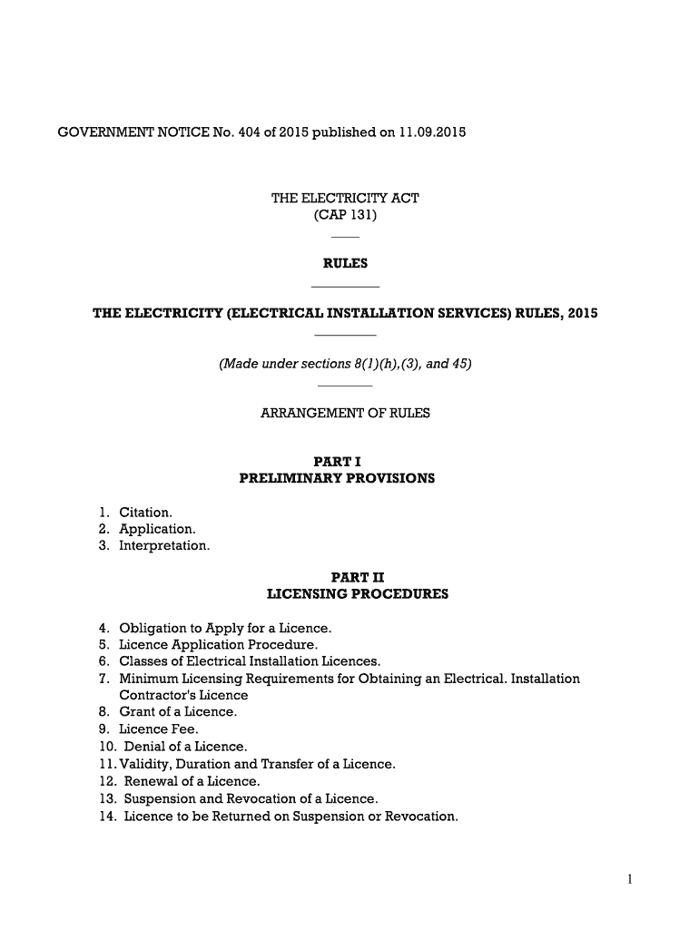 GOVERNMENT NOTICE No. 404 of 2015 published on 11.09.2015THE ELECTRICITY ACT (CAP 131) RULES THE ELECTRICITY (ELECTRICAL INSTALLATION SERVICES) RULES, 2015 (Made under sections 8(1)(h), (3), and 45)