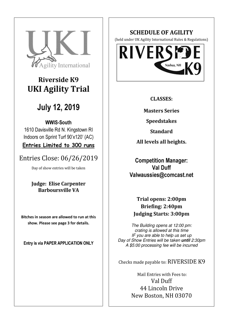 SCHEDULE OF AGILITY (held under UK Agility International Rules & Regulations)Riverside K9UKI Agility Trial CLASSES:July 12, 2019, WWISSouth 1610 Louisville Rd N. Kingstown RI Indoors on Sprint Turf