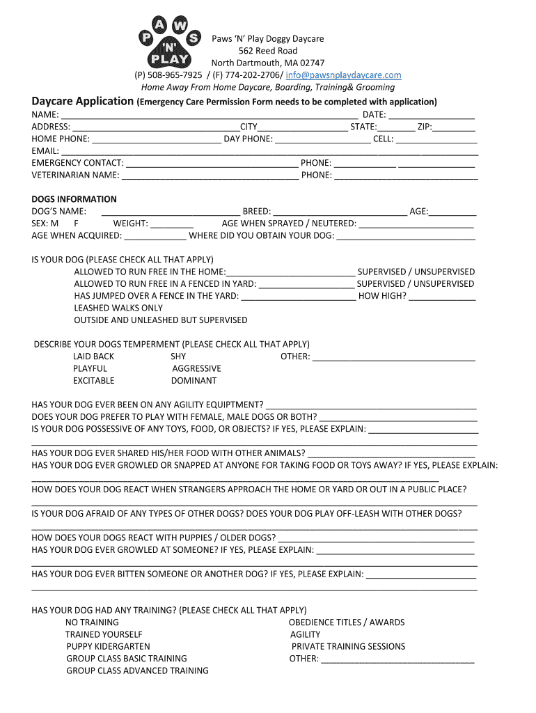 Paws N Play Dog Daycare 562 Reed Road North Dartmouth, MA 02747 (P) 5089657925 / (F) 7742022706/ info pawsnplaydaycare.com Home Away From Home Daycare, Boarding, Training Grooming Daycare Application