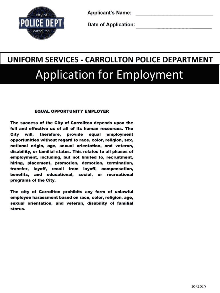 Applicants Name: Date of Application:UNIFORM SERVICES CARROLLTON POLICE Departmentalization for Employment EQUAL OPPORTUNITY EMPLOYER The success of the City of Carrollton depends upon the full and
