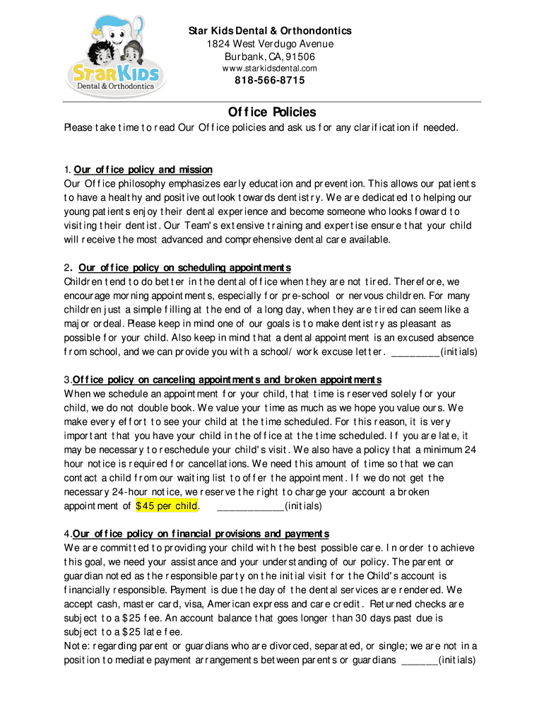 Star Kids Dental & Orthodontics 1824 West Verdugo Avenue Burbank, CA, 91506 www.starkidsdental.com8185668715Office Policies Please take time to read Our Office policies and ask us for any clarification