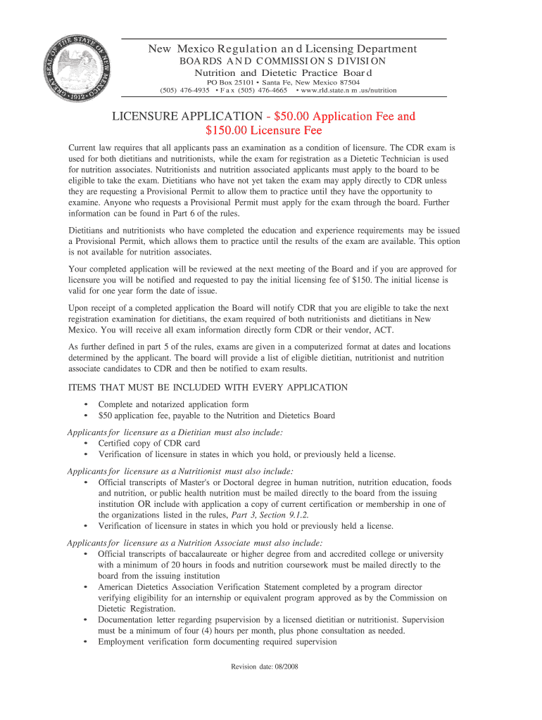 New Mexico Regulation a d Licensing Department BOA RDS A N D C COMMISSION ON S D IFISI ON Nutrition and Dietetic Practice Boar d PO Box 25101 Santa Fe, New Mexico 87504 (505) 4764935 F an x (505)