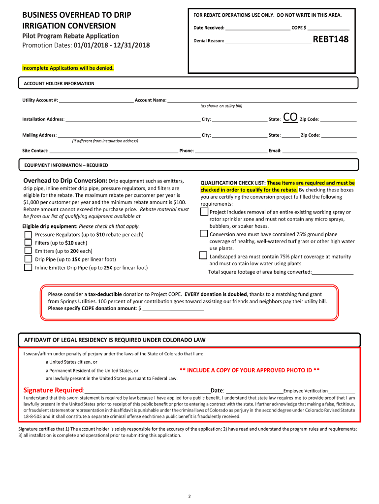 BUSINESS OVERHEAD TO DRIP IRRIGATION CONVERSIONPilot Program Rebate Application Promotion Dates: 01/01/2018 12/31/2018 PROGRAM RULES AND QUALIFICATIONSGeneral Requirements Available for replacement