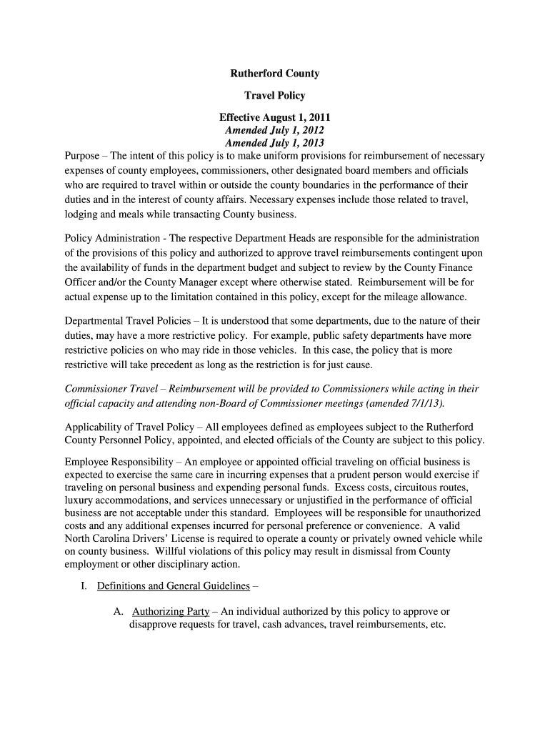 Rutherford County Travel Policy Effective August 1, 2011, Amended July 1, 2012, Amended July 1, 2013, Purpose The intent of this policy is to make uniform provisions for reimbursement of necessary