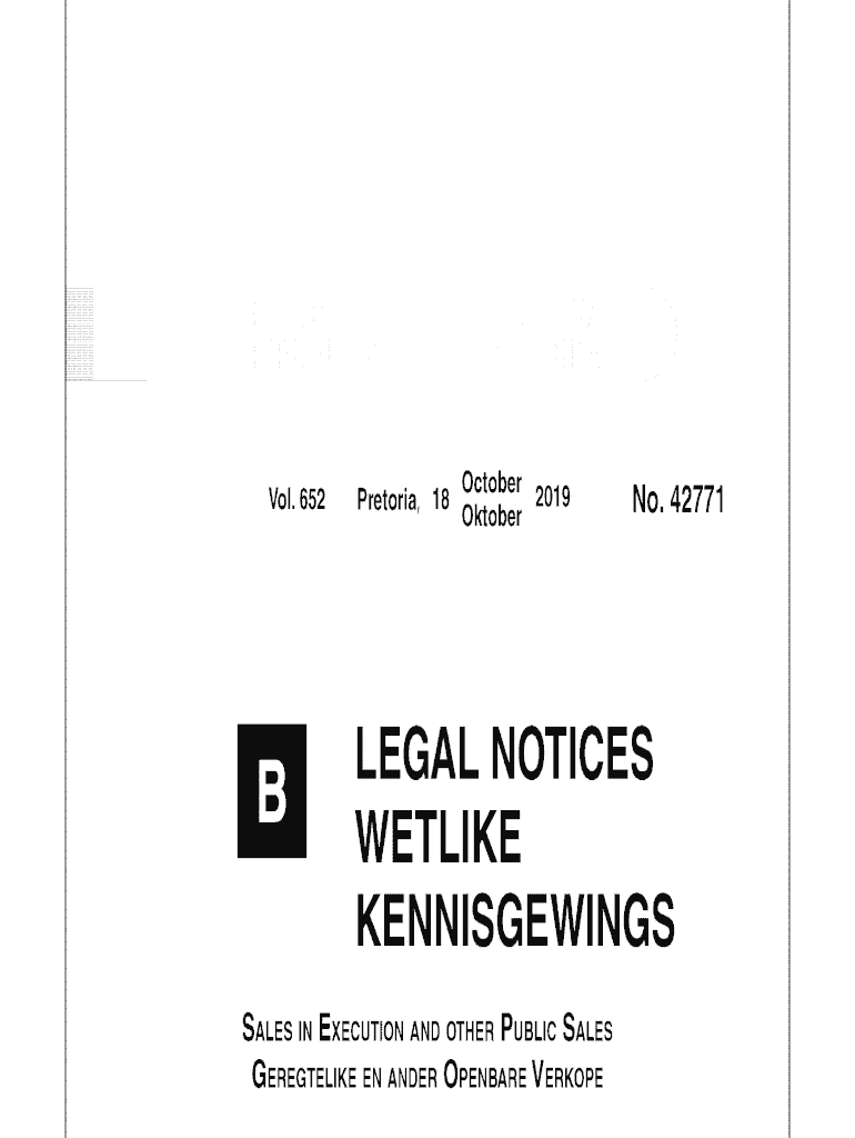 Vol. 652. October Pretoria, 18 October 2019No. 42771LEGAL NOTICES WARLIKE KENNISGEWINGS SALES IN EXECUTION AND OTHER PUBLIC SALES GEREGTELIKE EN UNDER OVENWARE VERKOPE2 No. 42771GOVERNMENT GAZETTE,