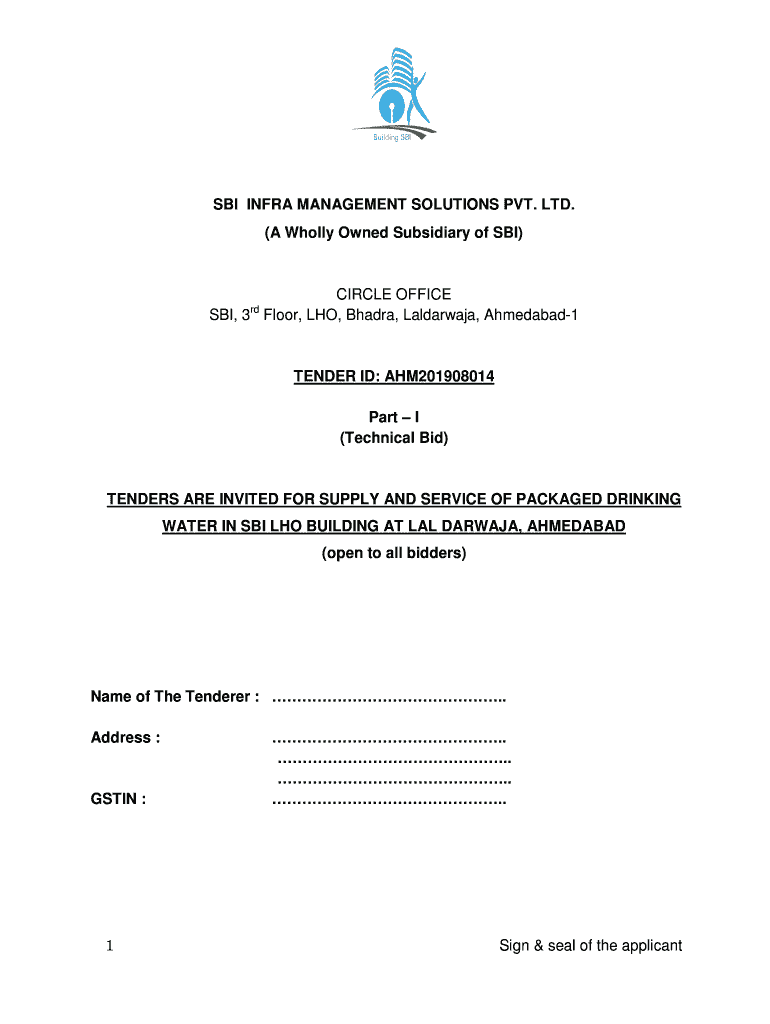 SBI INFRA MANAGEMENT SOLUTIONS PVT. LTD. (A Wholly Owned Subsidiary of SBI)CIRCLE OFFICE SBI, 3 Floor, WHO, Chandra, Laldarwaja, Ahmedabad1 tender ID: AHM201908014 Part I (Technical Bid)TENDERS ARE