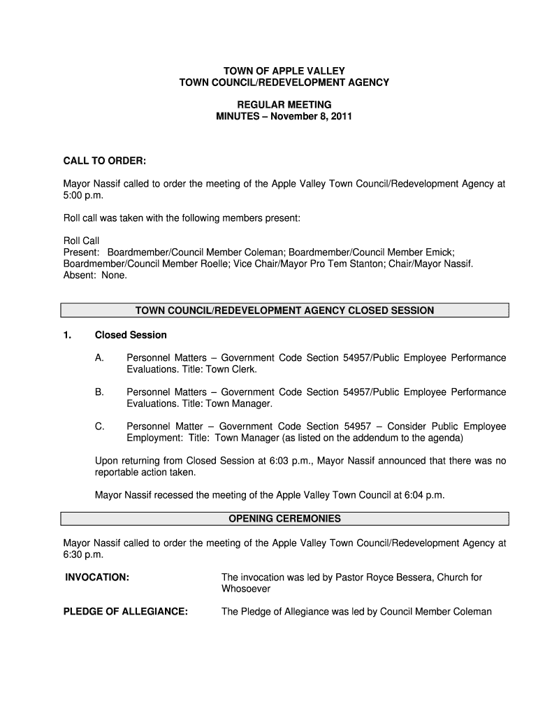 TOWN OF APPLE VALLEY TOWN COUNCIL/REDEVELOPMENT AGENCY REGULAR MEETING MINUTES November 8, 2011CALL TO ORDER: Mayor Massif called to order the meeting of the Apple Valley Town Council/Redevelopment