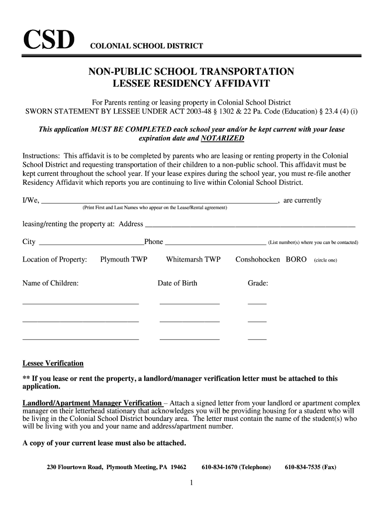 COLONIAL SCHOOL DISTRICTNONPUBLIC SCHOOL TRANSPORTATION LESSEE RESIDENCY AFFIDAVIT For Parents renting or leasing property in Colonial School District SWORN STATEMENT BY LESSEE UNDER ACT 200348 1302