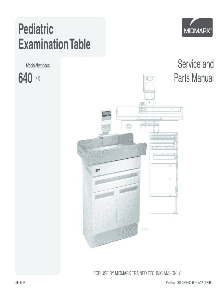 Next To Table Of ContentsPediatric Examination Table Model Numbers:640(all)Service and Parts Manual USE BY TIDEMARK TRAINED TECHNICIANS ONLY SF1918 Style Part No. 004055900 Rev. AA2 (1/8/19)Troubleshooting