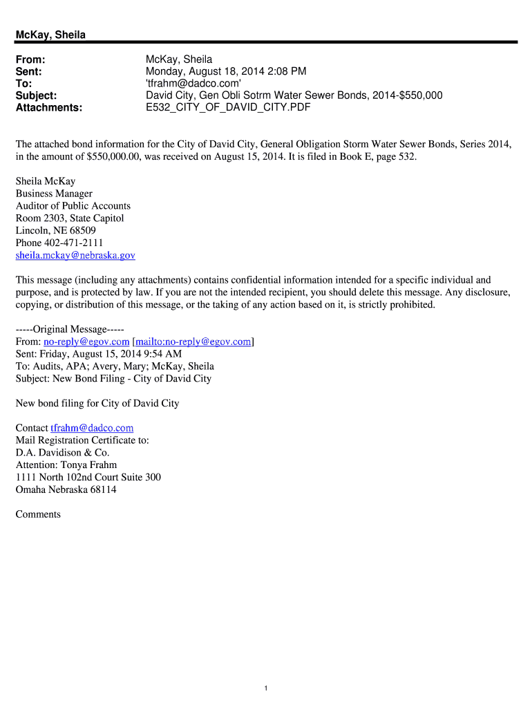 McKay, Sheila From: Sent: To: Subject: Attachments:McKay, Sheila Monday, August 18, 2014 2:08 PM 'tram dadco.com David City, Gen Obi Storm Water Sewer Bonds, $2014550,000 E532 CITY OF DAVID CITY.