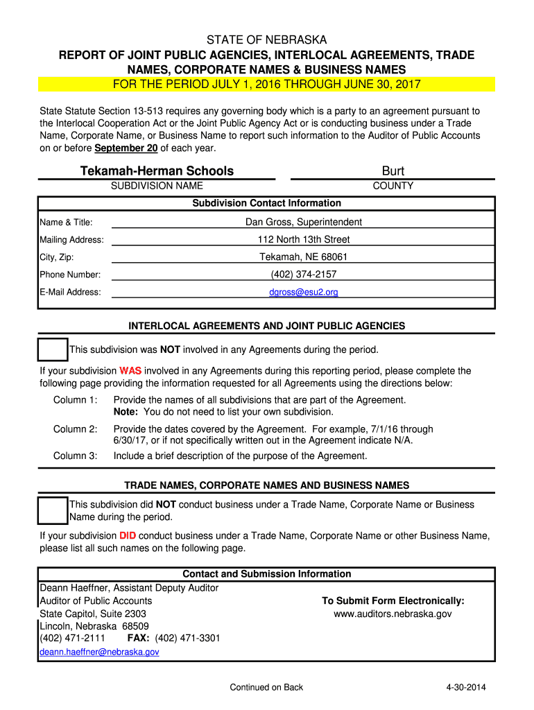 STATE OF NEBRASKA REPORT OF JOINT PUBLIC AGENCIES, INTERLOCK AGREEMENTS, TRADE NAMES, CORPORATE NAMES & BUSINESS NAMES FOR THE PERIOD JULY 1, 2016, THROUGH JUNE 30, 2017, State Statute Section 13513