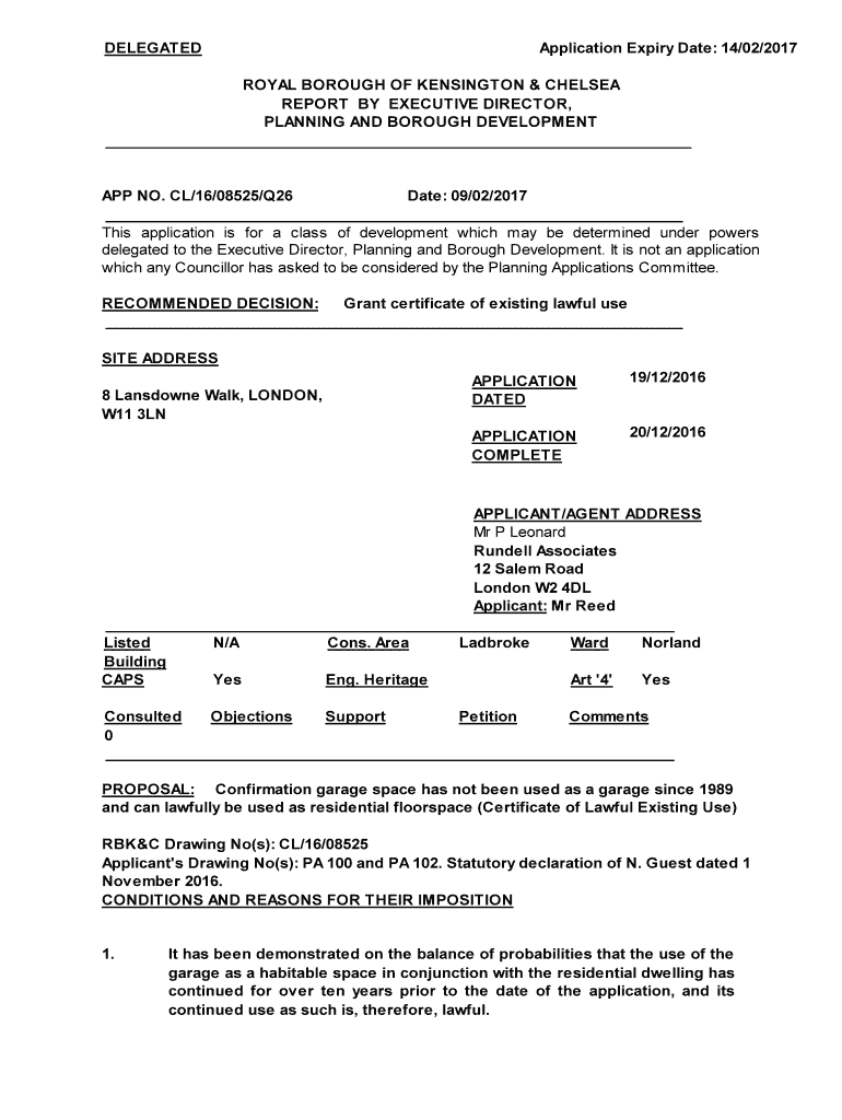 DELEGATEDApplication Expiry Date: 14/02/2017ROYAL BOROUGH OF KENSINGTON & CHELSEA REPORT BY EXECUTIVE DIRECTOR, PLANNING AND BOROUGH DEVELOPMENT APP NO. CL/16/08525/Q26 Date: 09/02/2017 This application