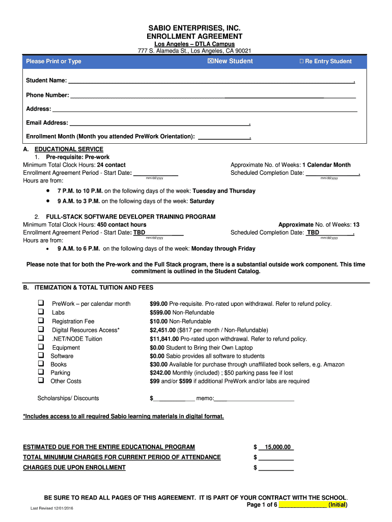 SABIN ENTERPRISES, INC. ENROLLMENT AGREEMENT Los Angeles DLA Campus 777 S. Alameda St., Los Angeles, CA 90021 Re Entry Students StudentPlease Print or Type Student Name:. Phone Number: Address: Email
