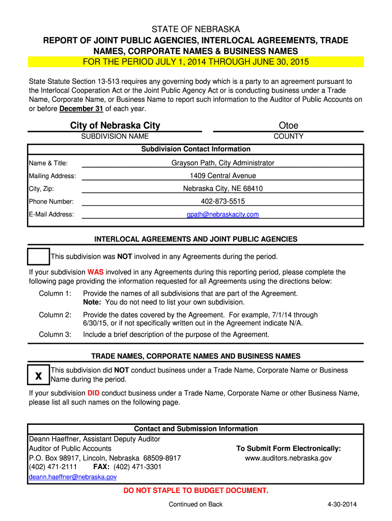 STATE OF NEBRASKA REPORT OF JOINT PUBLIC AGENCIES, INTERLOCK AGREEMENTS, TRADE NAMES, CORPORATE NAMES & BUSINESS NAMES FOR THE PERIOD JULY 1, 2014, THROUGH JUNE 30, 2015, State Statute Section 13513