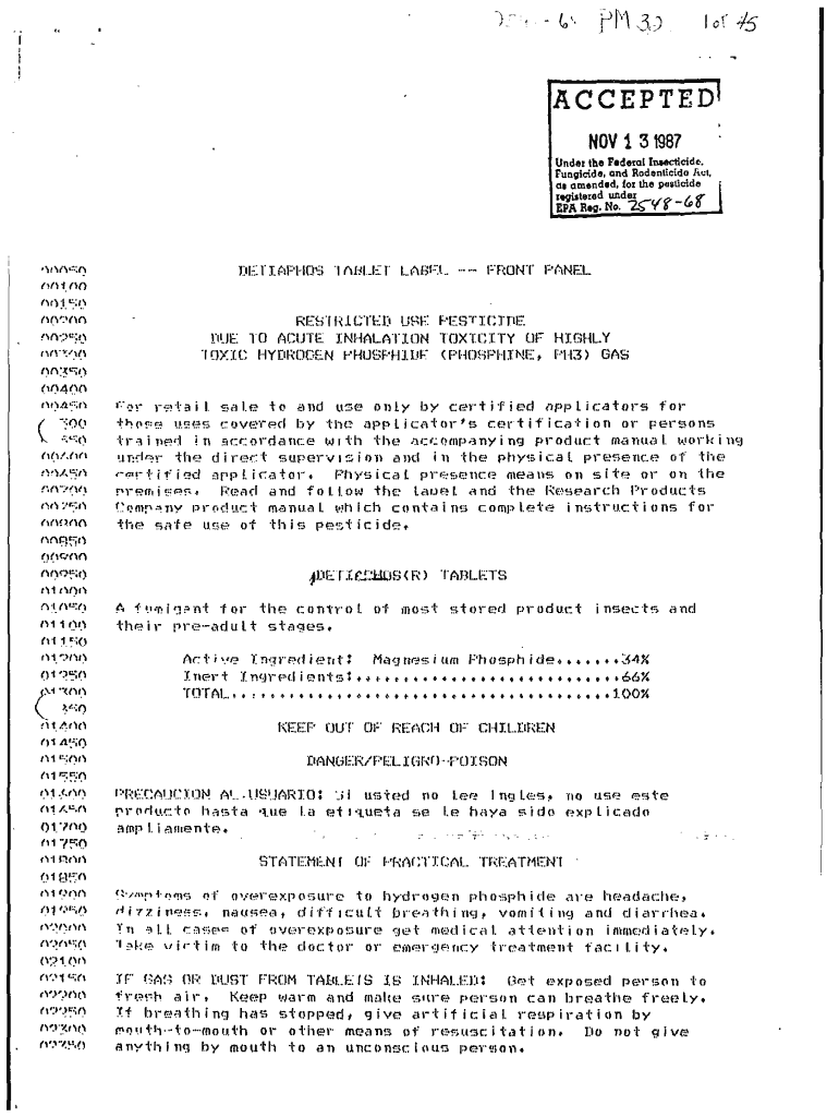 , ', ACCEPTED NOV 1 31987 Under the FederalInMCticid. Fungicide. And Rodenticide Ct. a. amend’d, for the pellucid, gist, OD undo, f EPA Dog, No, FDI, : RR.thou '! Issue:: r TTF. ., FRONT PANEL ':