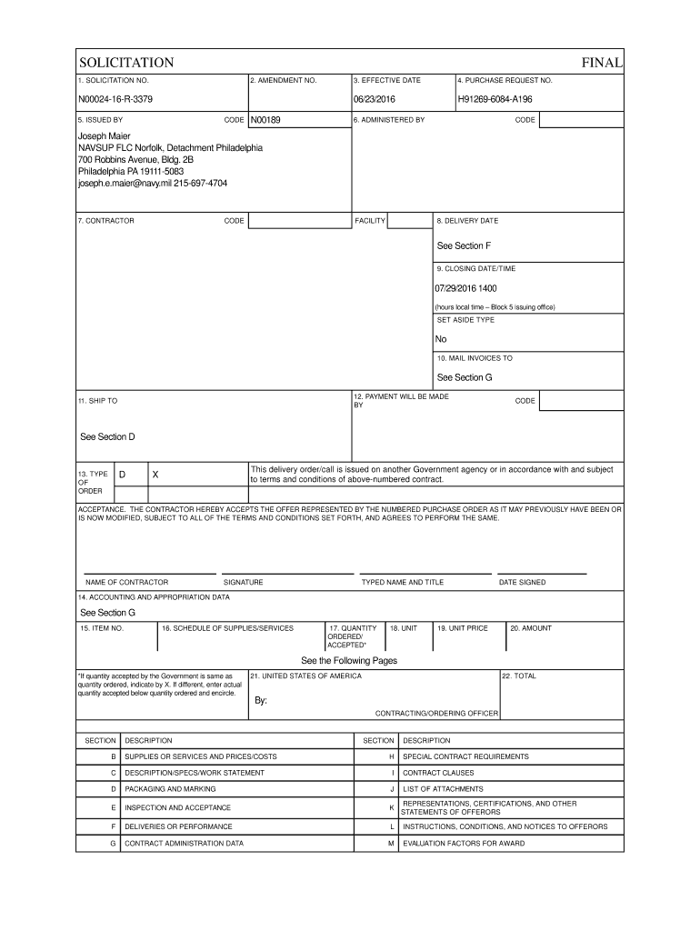 SOLICITATIONFINAL1. SOLICITATION NO.2. AMENDMENT NO. N0002416R3379 5. ISSUED BYCODEN001893. EFFECTIVE DATE4. PURCHASE REQUEST NO.06/23/2016H912696084A1966. ADMINISTERED BYCODEJoseph Maier NAVY FLY