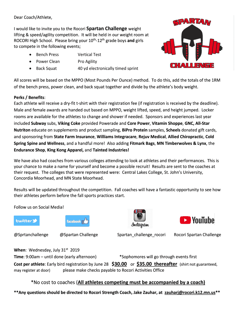 Stagecoach/Athlete, IwouldliketoinviteyoutotheRocoriSpartanChallengeweight lifting&speed/agility competition. Itwillbeheldinourweightroomat ROCORIHighSchool. Pleasebringyour10th12thgradeboysandgirls