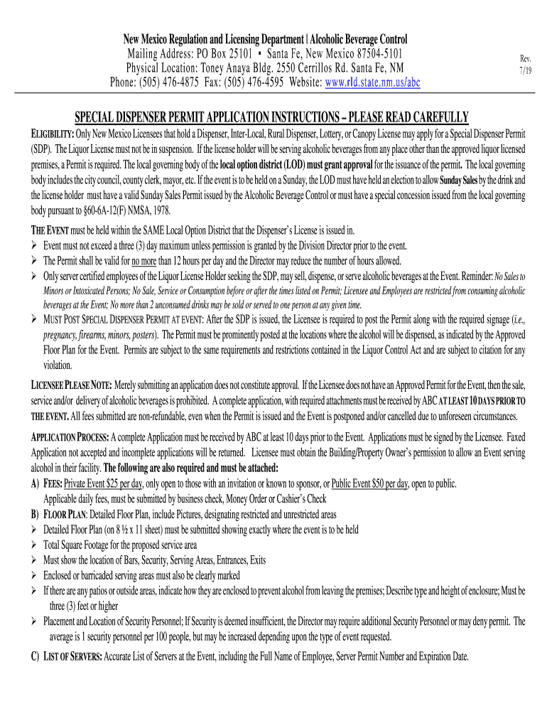 New Mexico Regulation and Licensing Department Alcoholic Beverage Control Mailing Address: PO Box 25101 Santa Fe, New Mexico 875045101 Physical Location: Money Ana ya Bldg. 2550 Carrillo Rd. Santa