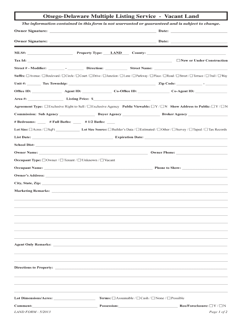 The Otsego-Delaware Vacant Land Form is a real estate document used by property owners and agents to list vacant land for sale in the Otsego-Delaware area.