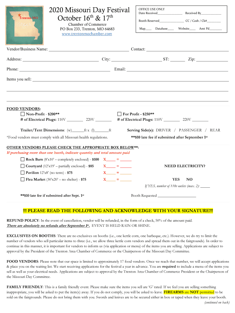 Trenton MO2020 Missouri Day Festival October 16th & 17thOFFICE USE ONLY Date Received By Booth Reserved CC / Cash / Ck# Chamber of Commerce PO Box 233, Trenton, MO 64683 www.trentonmochamber.comMap