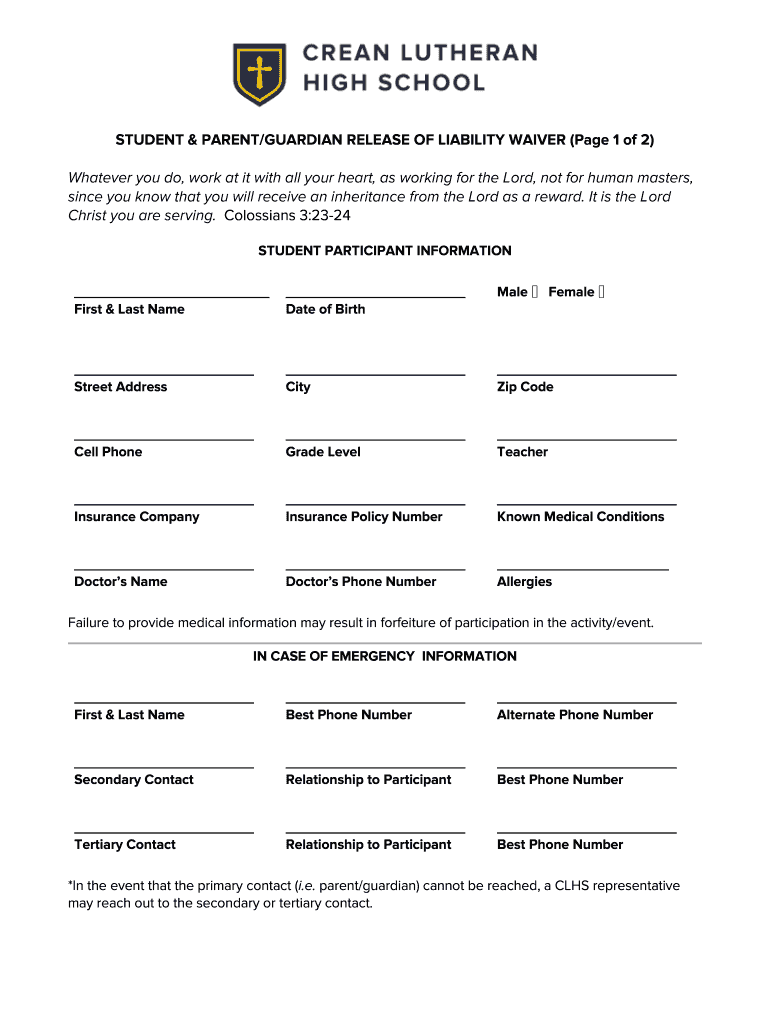 STUDENT & PARENT/GUARDIAN RELEASE OF LIABILITY WAIVER (Page 1 of 2) Whatever you do, work at it with all your heart, as working for the Lord, not for human masters, since you know that you will receive