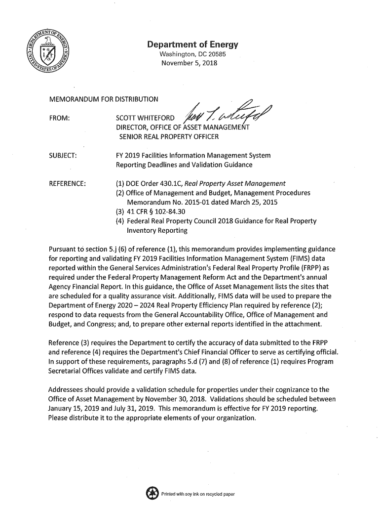 This guidance provides Fiscal Year (FY) 2019 Facilities