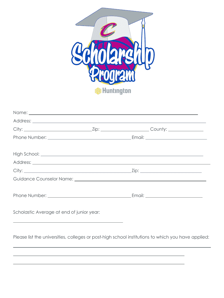 Name: Address: City: Zip: County: Phone Number: Email: High School: Address: City: Zip: Guidance Counselor Name: Phone Number: Email: Scholastic Average at end of junior year: Please list the universities,